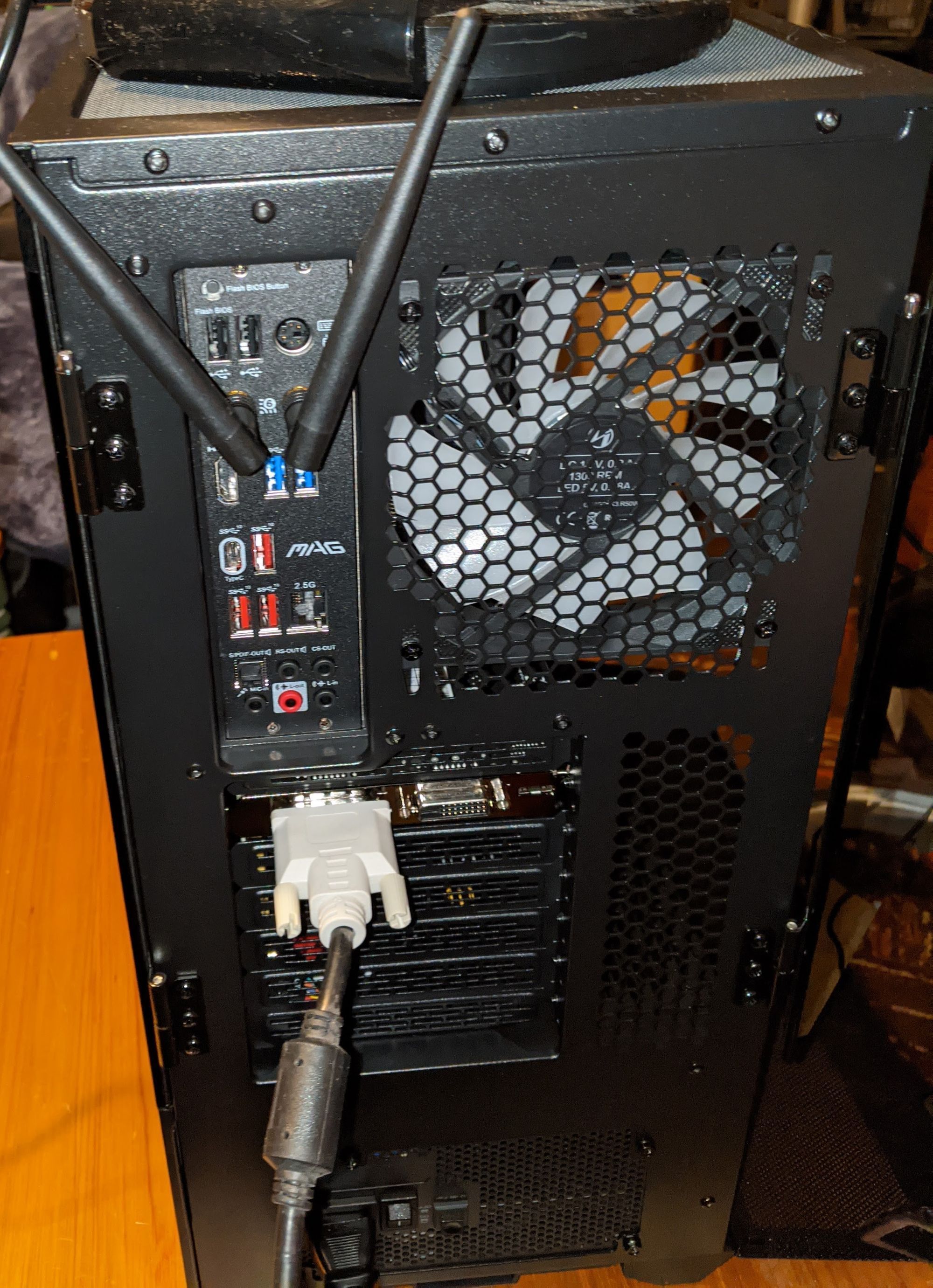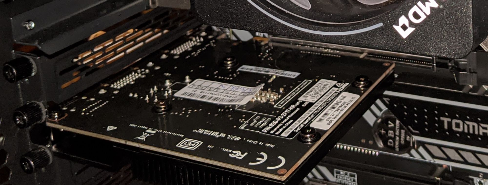 So right now, I'm actually using a much older Nvidia GT 710, which my wife had sitting around waiting to go into a box of hers to revive it (in exchange for borrowing it, I will install the card for her in her box when I'm done with it). This occasioned some late-stage scrambling when I realized that I didn't have an HDMI cable that had mHDMI (m for mini) on one end, which meant I needed a DVI cable...and a monitor that could take in DVI! Fortunately, I still had one older DVI-able monitor.